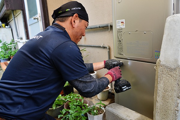 トイレの壁面から音がしているような気がするということでしたので、トイレの近くに設置してある給湯器の裏面があやしいということでチェックをします。