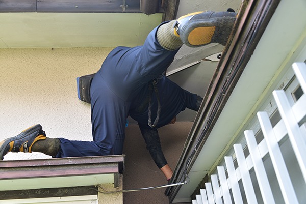 お客様との挨拶、被害状況のヒアリング、本日行う施工のおおまかな説明をしたあと、まず最初にとりかかるのは「イタチが侵入できる隙間の確認」です。