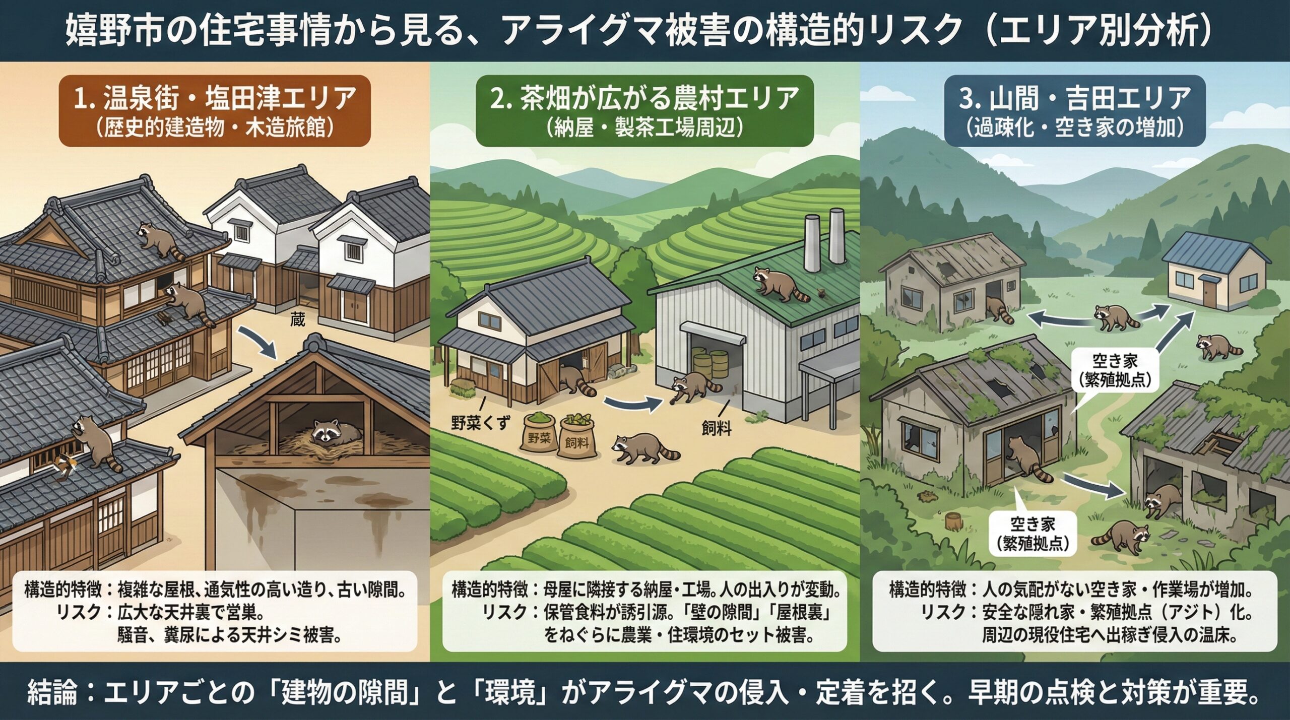 吉田地区(肥前吉田焼の里)や市境の山間地域では、高齢化に伴い、空き家や管理が行き届かない元陶房・作業場が増加しています。 これらは人の気配がなく、雨風をしのげる絶好の隠れ家です。天井裏や床下に長期間居座っても発見されにくく、ここを「安全な繁殖拠点(アジト)」として、周辺の人が住んでいる現役住宅へ出稼ぎのように侵入を繰り返す、被害拡大の「温床」となっています。