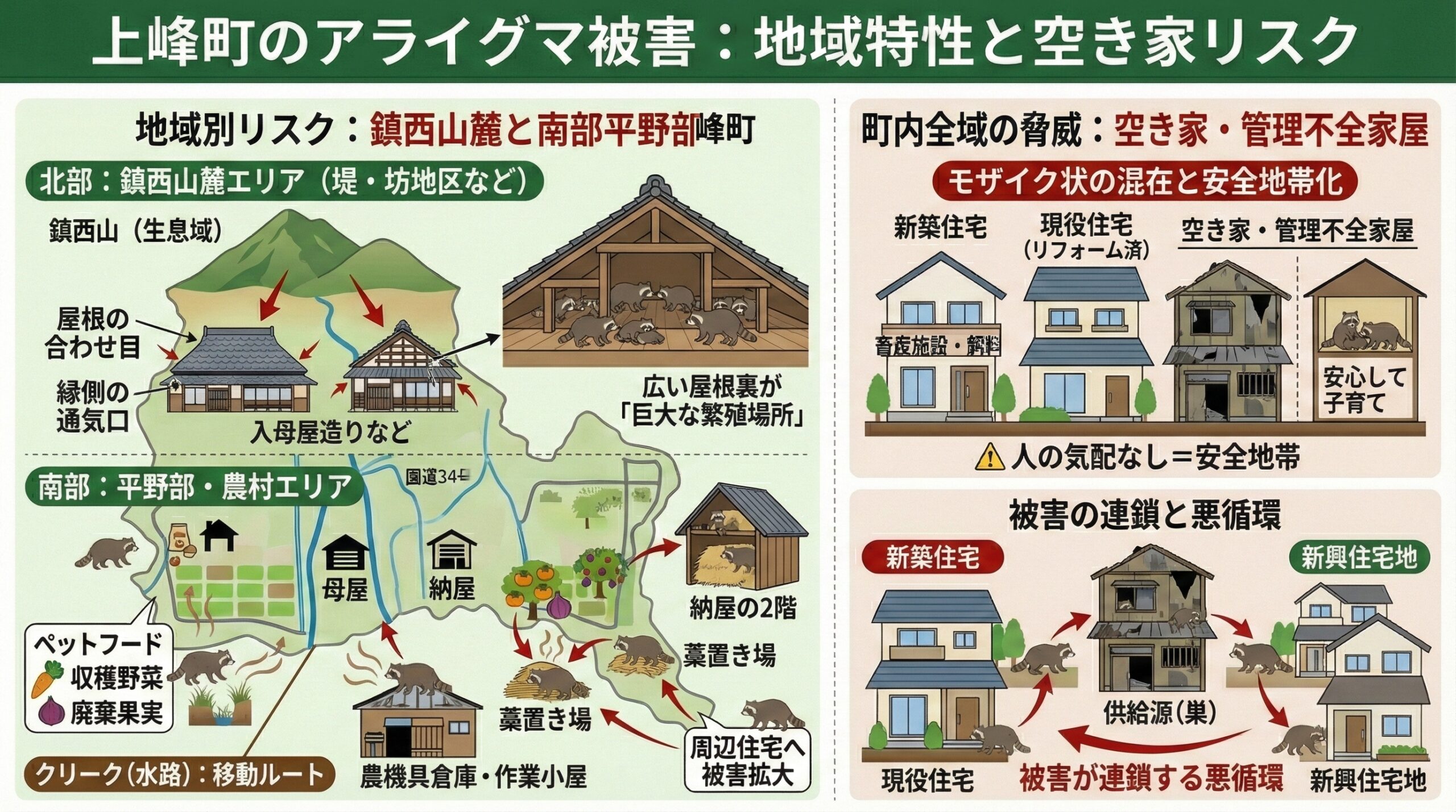 町内全域の空き家・管理不全家屋の問題も見逃せません。上峰町はベッドタウンとして新築住宅が増える一方で、高齢化により管理が行き届かなくなった空き家が既存集落の中に「モザイク状」に混在しています。これらは人の気配がないため、アライグマにとって警戒心を解いて安心して子育てができる「安全地帯」となります。ここが供給源(巣)となり、隣接するリフォーム済みの現役住宅や新興住宅地の庭先へと被害が連鎖する悪循環が懸念されています。