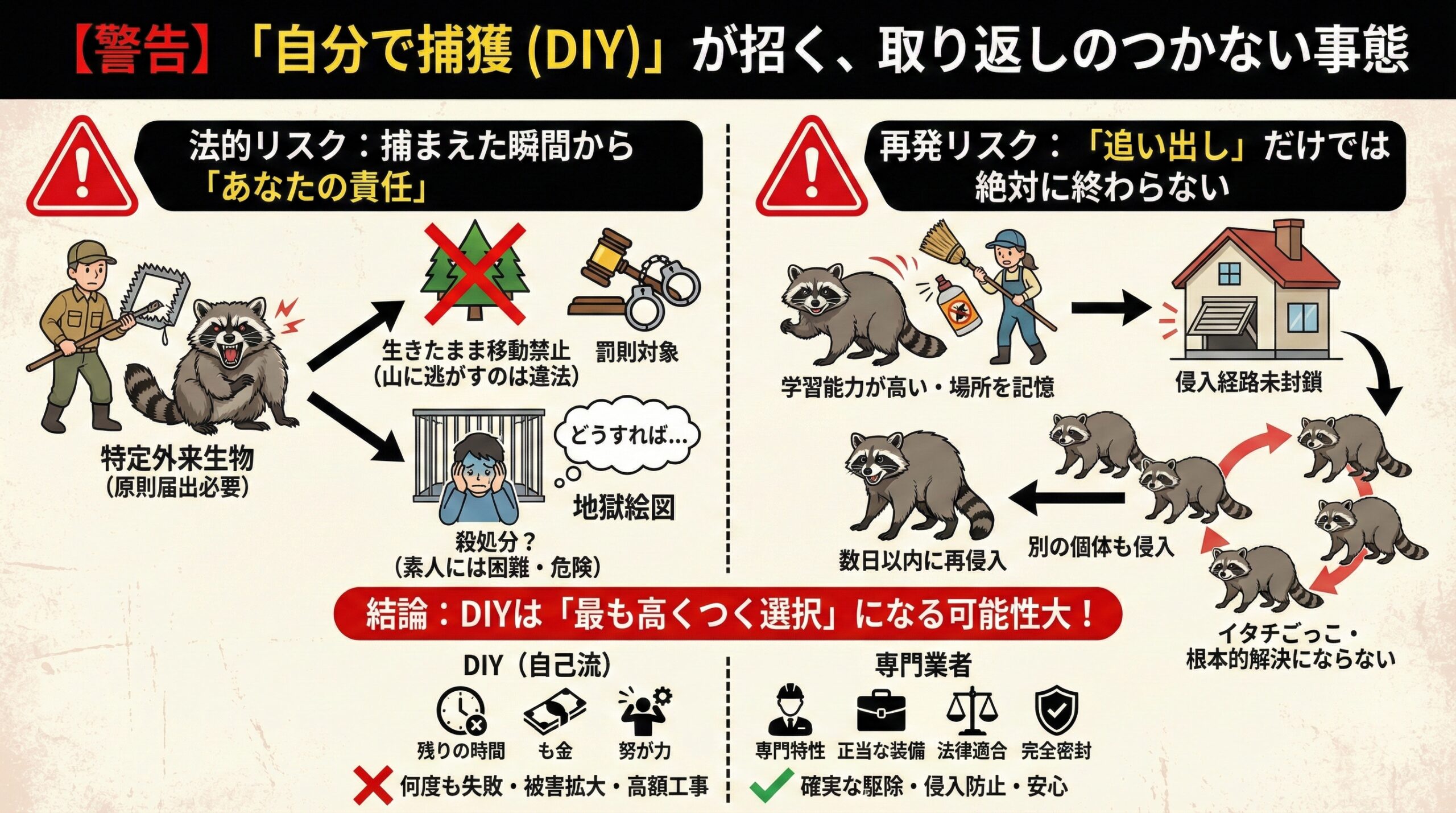 また、専門知識のない個人による不適切な追い出しや中途半端な対策は、警戒心を高めたアライグマを近隣の住宅や別の集落へ拡散させる原因となります。コンパクトな町域に住宅と農地が混在する上峰町では、この「被害のたらい回し」が起きやすいため、法令を遵守し、かつ地域全体のリスクを最小限に抑えるためにも、駆除は専門業者へ依頼することが最も安全かつ確実な選択肢です。