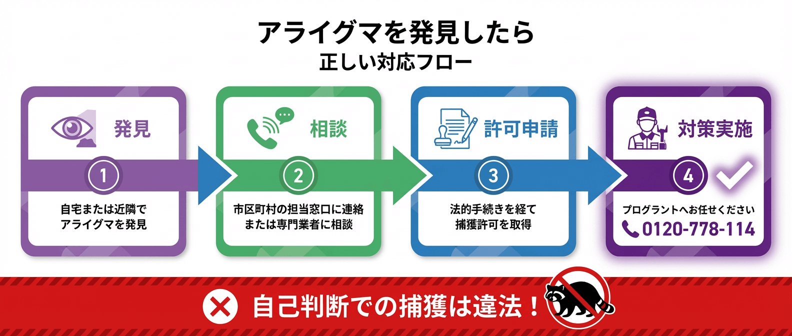 福岡市内でアライグマを発見した場合、まず市区町村の担当窓口または専門業者に相談することが推奨されます。自己判断での捕獲は法律違反となるだけでなく、咬傷事故や感染症リスクもあります。