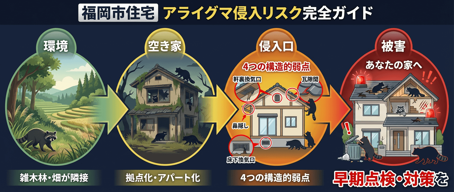 福岡市の空き家対策計画によると、城南区・西区・東区で空き家率が相対的に高く、特に西区は”放置系空き家”の割合が高いと指摘されています。実務者の現場経験では「西区の今津や今宿は空き家がアライグマの”アパート”化し、そこを拠点に周辺住宅へ被害が拡大するケースが多い」とされており、近隣に空き家がある場合は特に注意が必要です。