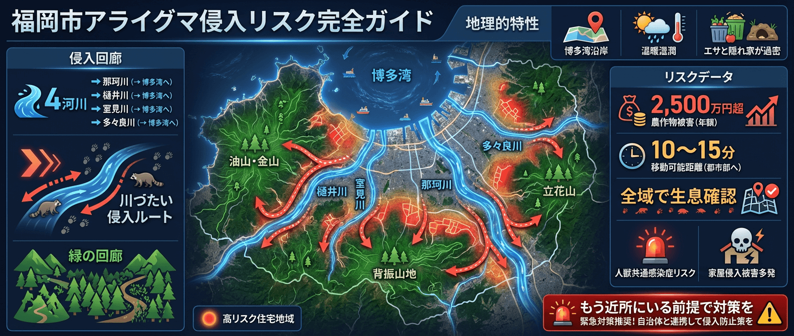 福岡市は博多湾沿岸に位置する温暖湿潤な都市であり、河川・緑地・港湾がコンパクトにまとまった「エサと隠れ家が過密な都市」です。この地理的特性が、アライグマにとって理想的な生息環境を提供しています。