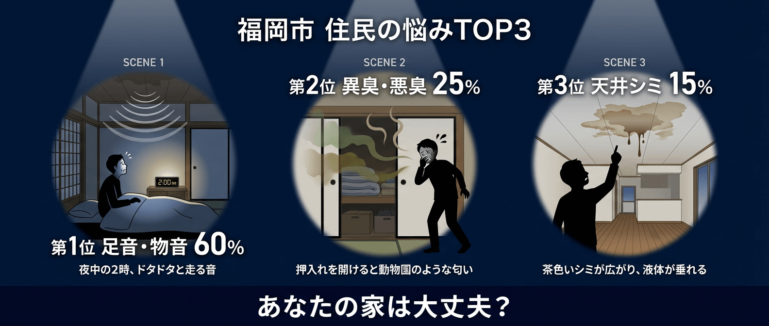第2位:異臭・悪臭(相談の約25%) 「天井から獣臭がする」「押入れを開けると動物園のような匂い」という相談が続きます。糞尿が断熱材に染み込むと、夏場は特に強烈な悪臭を放ち、健康被害の原因にもなります。